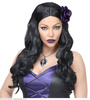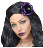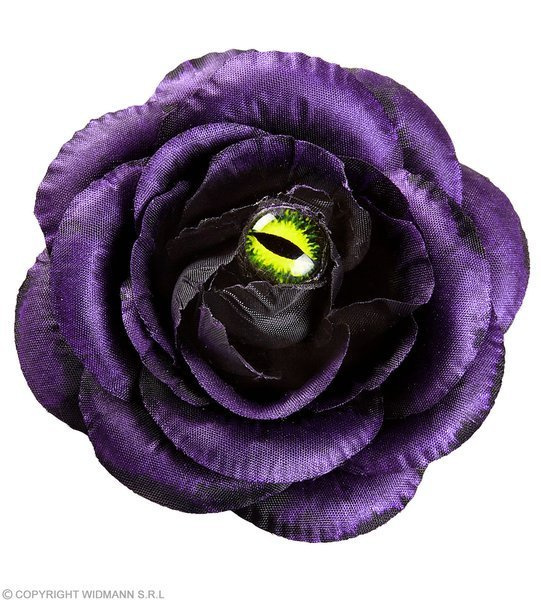 Spinka do włosów uformowana w kształt róży w kolorze fioletu i czerni. Do spinki doczepiono zielono-żółte kocie oko.