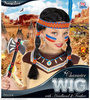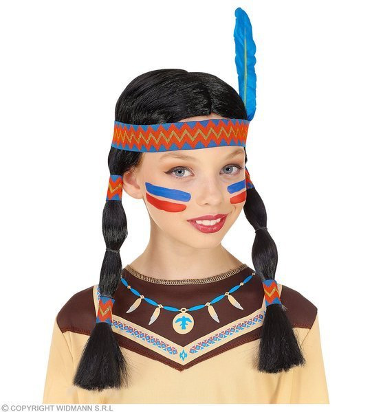 Peruka Indianki w kolorze czarnym. Włosy za ramiona, splecione w warkocze z niebiesko-czerwono-złotą opaską i niebieskim piórkiem. Rozmiar dziecięcy.
