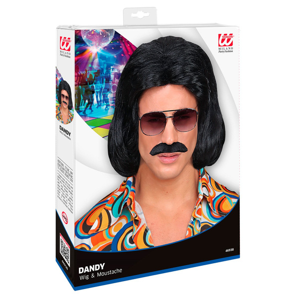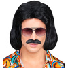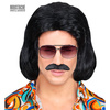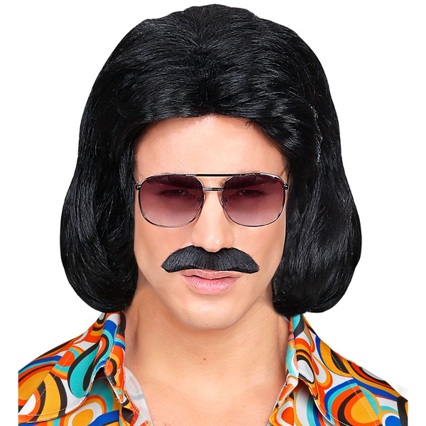 Peruka w kolorze czarnym. Włosy wywinięte lekko do środka. Mocowana na elastycznej siatce. Rozmiar uniwersalny. Wąsy proste, w kolorze czarnym.