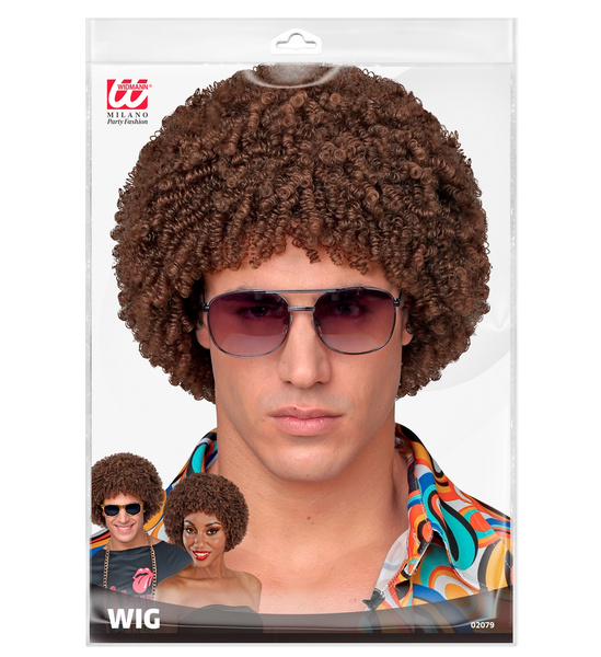 Peruka disco w stylu lat 70. Włosy w stylu afro, mocno kręcone w kolorze brązu. Mocowana na elastycznej siatce.
