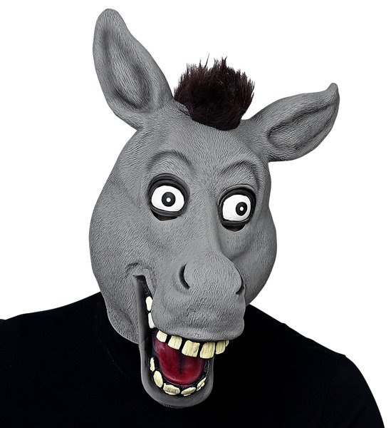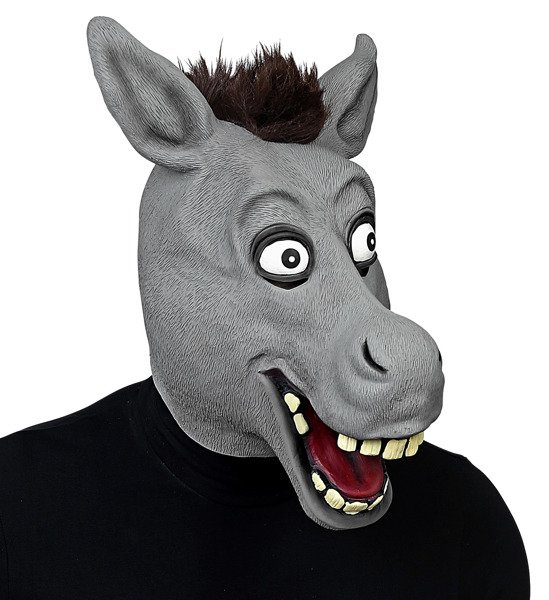 Maska wykonana z gumy-lateksu. Przedstawia głowę osła z uszami. Do maski doczepiono czarną sierść. Posiada wycięte otwory na oczy i usta.
