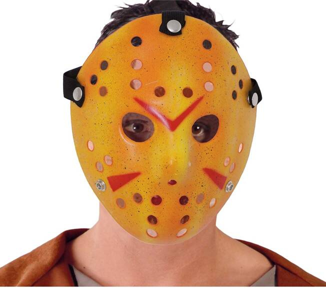 Maska wykonana ze sztywnego tworzywa, celowo pomalowana niedbale na kolor żółty, z czerwonymi elementami. Posiada otwory na oczy, dodatkowo niewielkie otwory na wysokości ust i czoła.