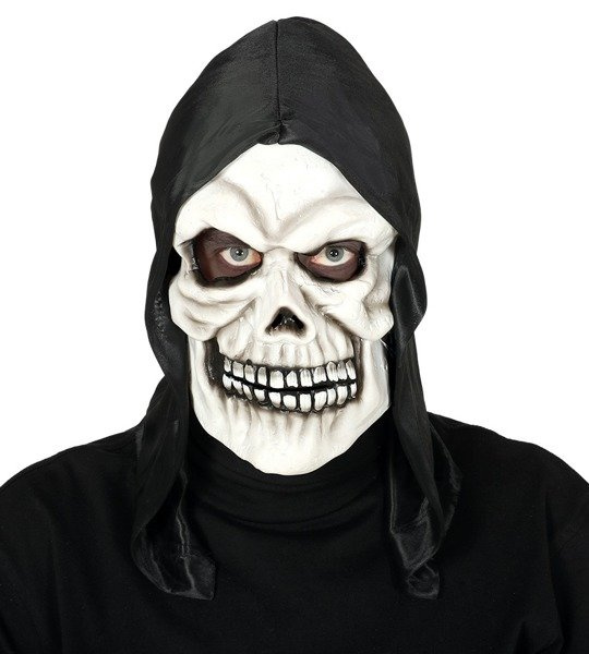 Maska gumowa-lateksowa przedstawiająca czaszkę, z doczepionym materiałowym kapturem. W masce wycięte są otwory na oczy, nos i usta.