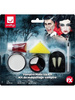 Farbki do malowania oczu w kolorach: bieli, czerwieni i czerni. Farbka do twarzy biała. Gąbeczka do nakładania farbki na twarz. Pędzelek do malowania oczu. Sztuczna krew do wykończenia makijażu wampira. Sztuczne kły bez których nie obejdzie się żaden wampir.
