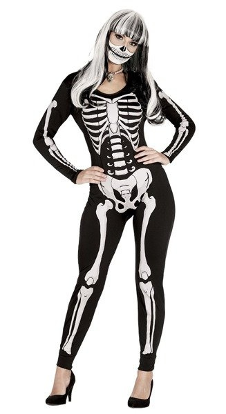 Kombinezon w kolorze czarnym, z długim rękawem i nogawkami. Posiada nadrukowany wzór ludzkiego szkieletu w kolorze białym. Zapinany z tyłu na zamek.