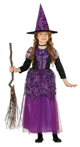 Dół sukienki lekko rozkloszowany, dwuwarstwowy. Spodnia warstwa fioletowa, ze śliskiego materiału. Warstwa zewnętrzna tiulowa, z czarnymi elementami.