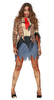 Bluzka składa się z dwóch części materiału. Na przodzie jaśniejsza, jakby bluzka wychodząca spod kurtki. Rękawy i dół wycięte w trójkąty. Część imitująca kurtkę jest koloru ciemnobrązowego, z jaśniejszymi plamkami. Do bluzki doszyty jest czerwony, postrzępiony krawat i czarny kawałek postrzępionego materiału.