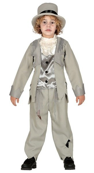 Bluzka z kurtką zszyte, w kolorze szarym, Bluzka ze śliskiego materiału, zdobiona czarnymi guzikami. Do bluzki doszyty zapinany na rzep kołnierz z żabotem. Kurta z matowego materiału z licznymi dziurami. Na dole nieregularnie powycinana.