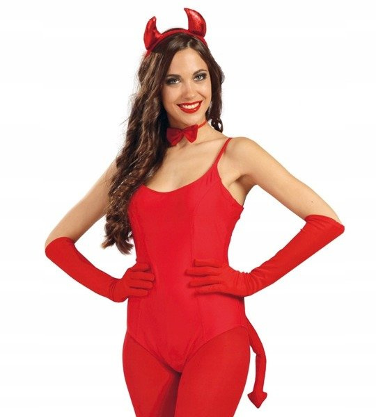 Rogi mocowane na opasce z tworzywa sztucznego pokrytej czerwonym materiałem. Rogi są błyszczące, wypełnione gąbką, lekko usztywniane. Ogon koloru czerwonego mocowany za pomocą agrafki, wypełniony gąbką. Mucha czerwona na elastycznej gumce.