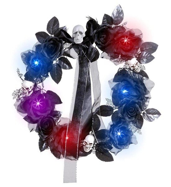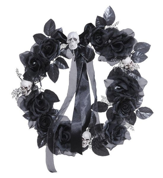 Miedzy kwiatami wczepione małe czaszki. Wykonane ze sztywnego tworzywa w kolorze kości.