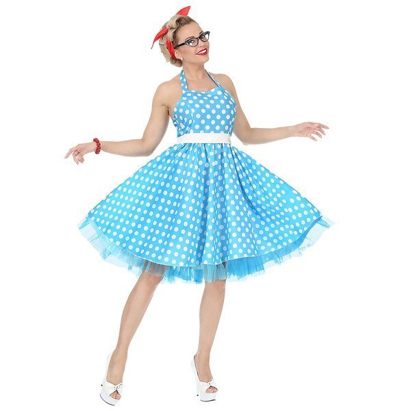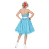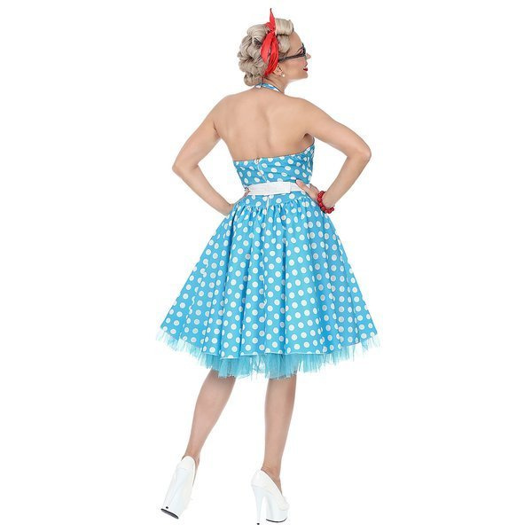 Sukienka bez ramiączek w kolorze niebieskim w białe grochy.