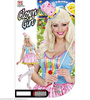 Dół sukienki różowy w kolorowe groszki, góra błękitna z pasiastą wstawką.