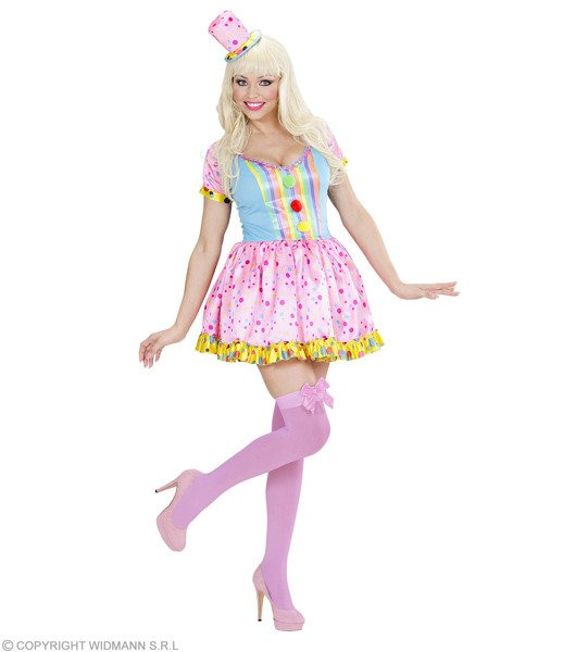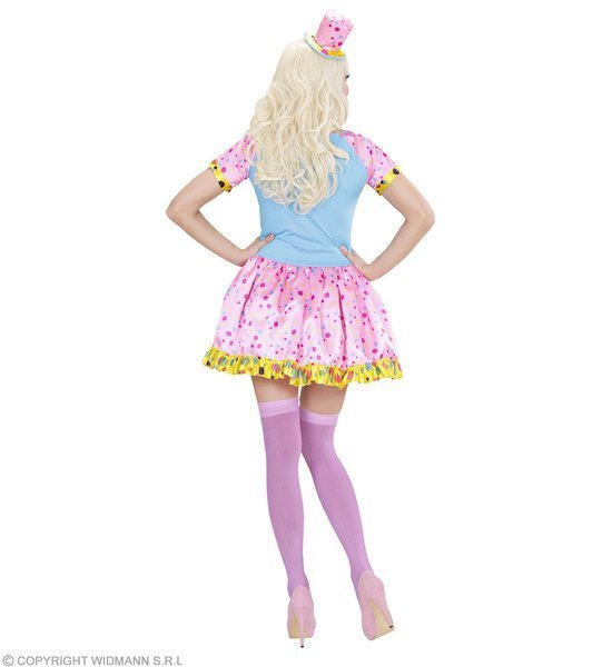 Dół sukienki różowy w kolorowe groszki, góra błękitna z pasiastą wstawką.