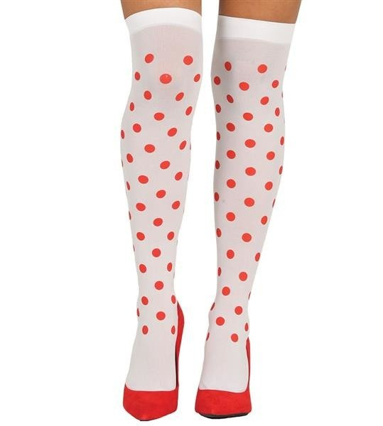 Białe zakolanówki z czerwonymi kropkami.