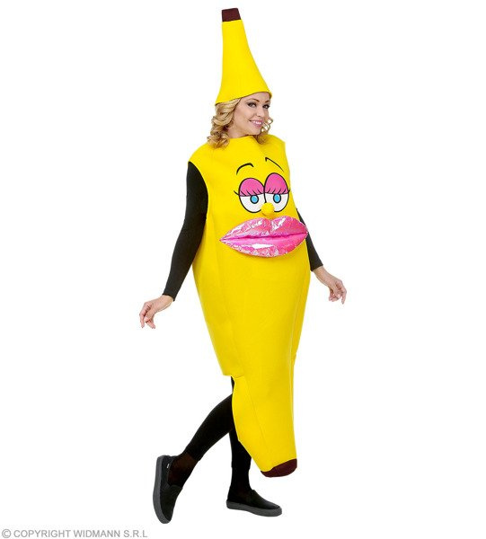 Żółty strój pani banan, z nadrukiem oczu oraz doszytymi dużymi ustami.