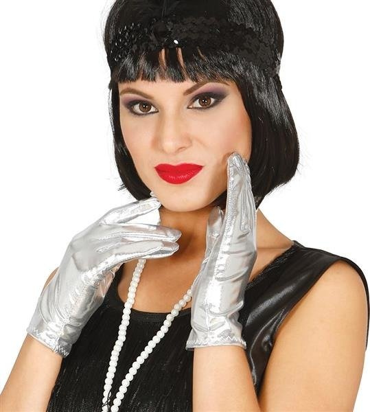 Srebrne rękawiczki wykonane z błyszczącego materiału.