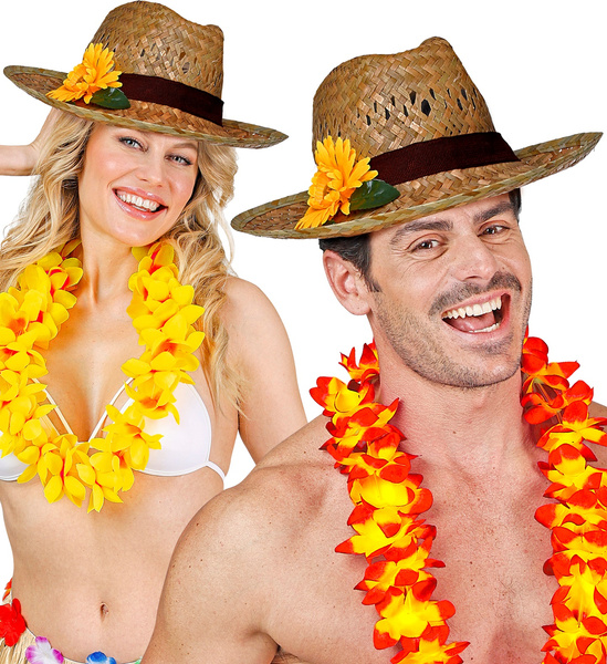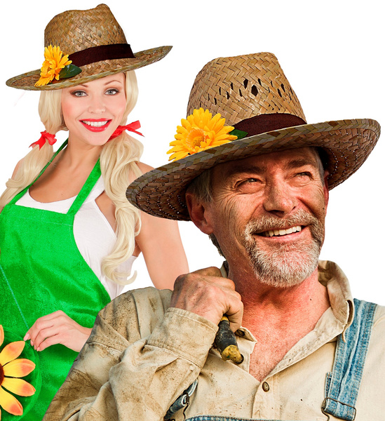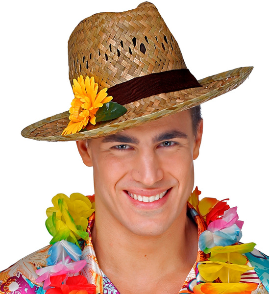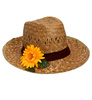 Słomkowy kapelusz z tasiemką i żółtym kwiatkiem.