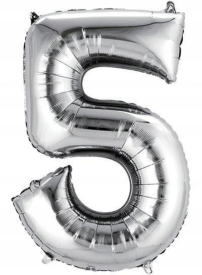 Balon foliowy, metaliczny w kształcie cyfry 5.