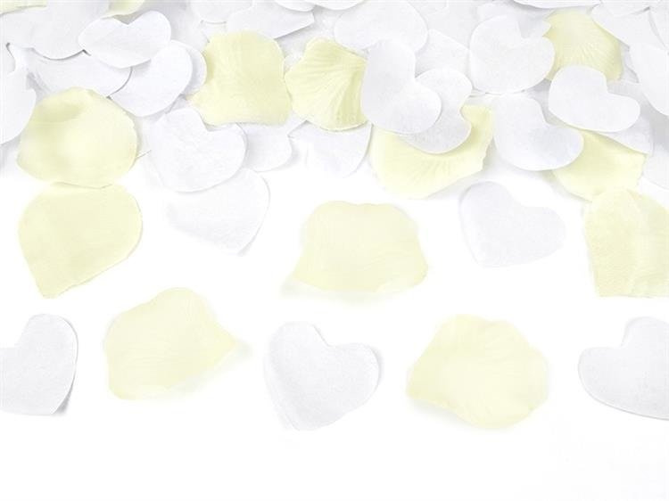 w kolorze białym oraz płatkami róż w kolorze kremowym.