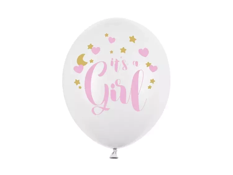 Balony Strong, Pastel Pure White z dwustronnym, różowo-złotym nadrukiem It's a Girl, średnica 30 cm(1 op. / 6 szt.)