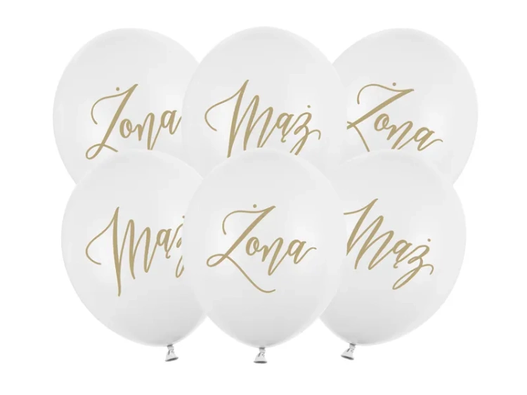 Białe pastelowe balony z dwustronnym złotym nadrukiem.