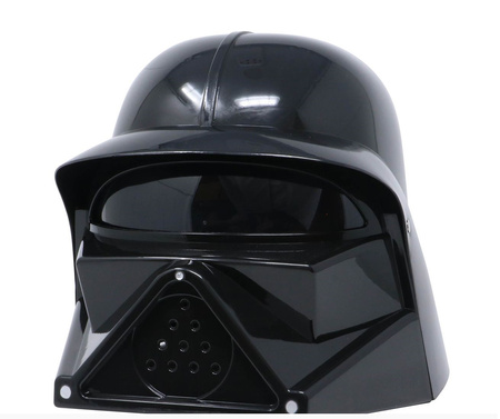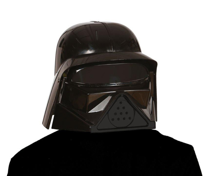 Kask czarny z tworzywa sztucznego, zasłaniający całą głowę.