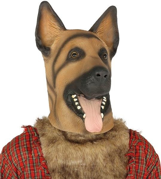 Przedstawia psa z wystającym językiem kolorze brązu i czerni.