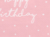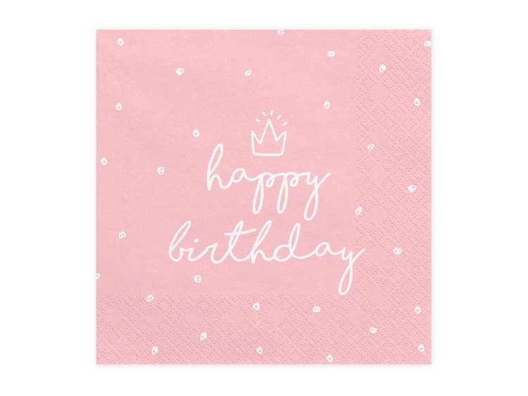 Serwetki trójwarstwowe Happy Birthday w kolorze jasnoróżowym z białym nadrukiem.