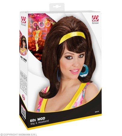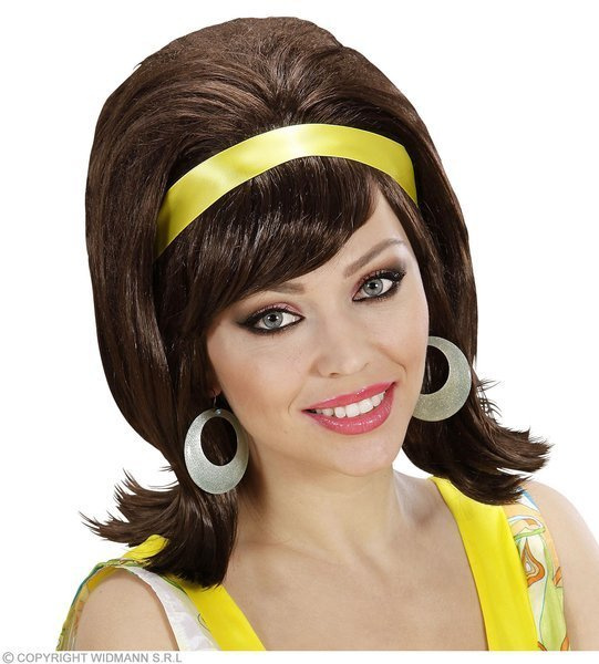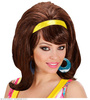Peruka w kolorze: brązowym.Włosy proste, z grzywką, lekko wywinięte końce.We włosy wczepiona żółta tasiemka.Peruka mocowana na elastycznej siatce.