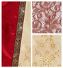 Sukienka z halką oraz długim rękawem, zdobione są złotymi wzorami, koronkowymi bufkami i ściągaczem.