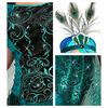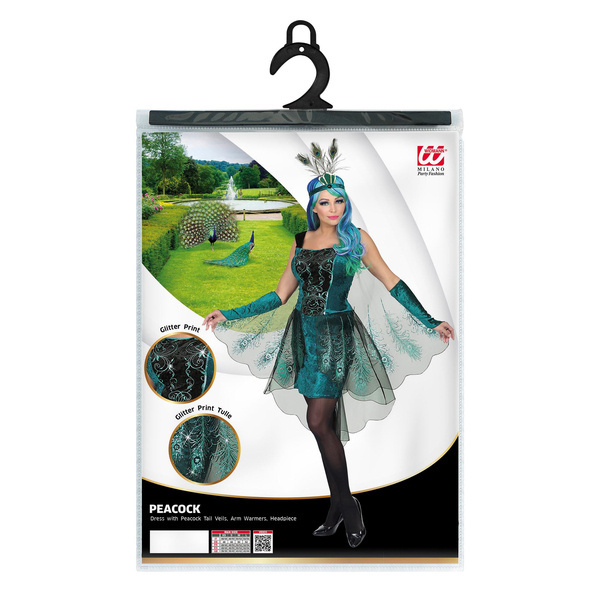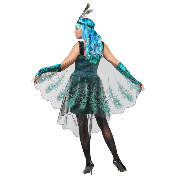 Do sukienki doszyto czarną, siateczkową pelerynkę, którą zdobią pawie pióra.