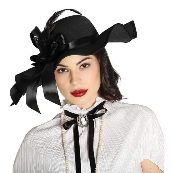 Wokół główki biegnie ozdobna tasiemka wiązana na kokardę z wetkniętym czarnym piórem.