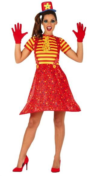 Dół sukienki imituję spódniczkę na szelkach, koloru czerwonego w kolorowe kropki.