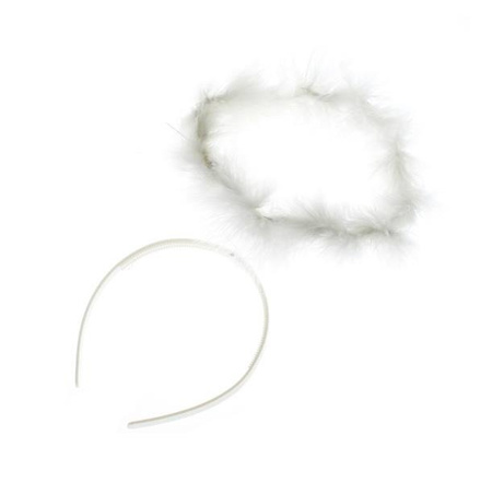 Doczepiona biała aureola z puszkiem i srebrną lametą.