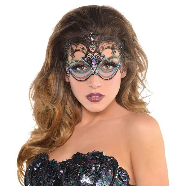 Piękna maska wykonana z tworzywa sztucznego w kolorze czarnym. Góra bogato zdobiona kolorowymi kamieniami.