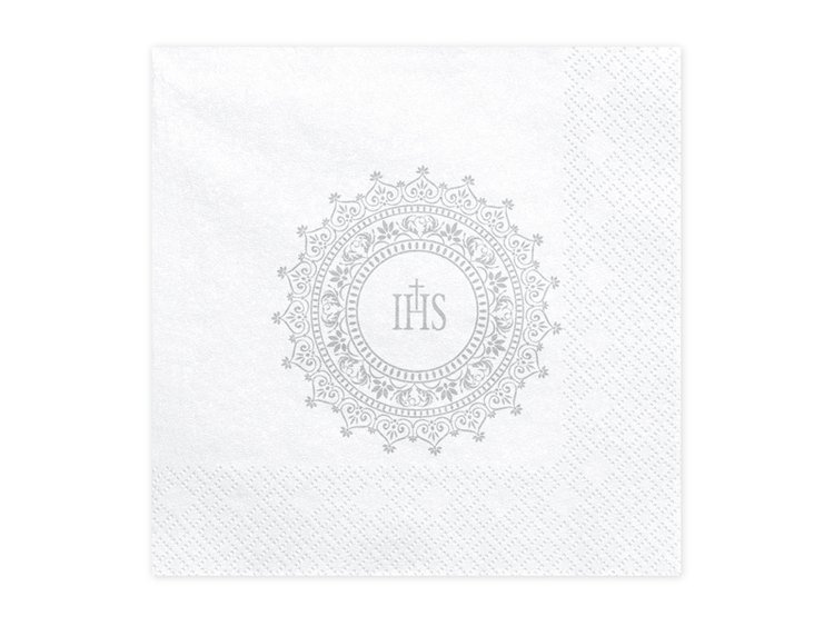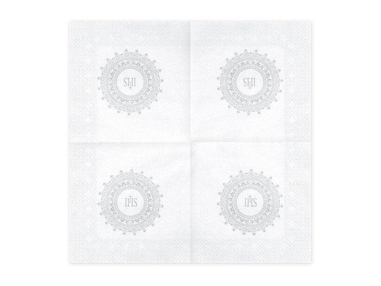 Zestaw serwetek w kolorze białym ze srebrnym nadrukiem IHS.