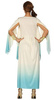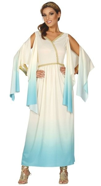 Sukienka w kolorze beżowym i błękitnym.