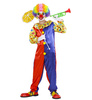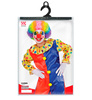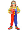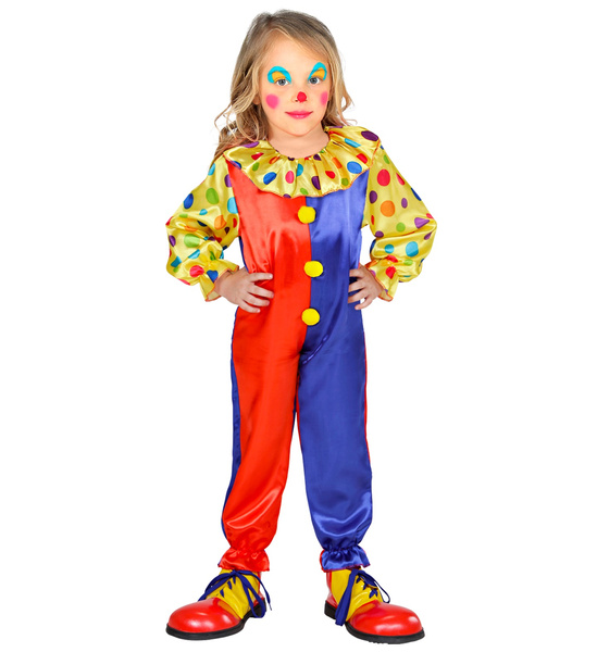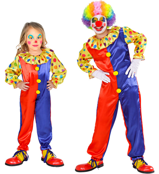 Kombinezon klauna w kolorze niebiesko-czerwonym, z wstawkami żółtego materiału w groszki.