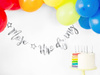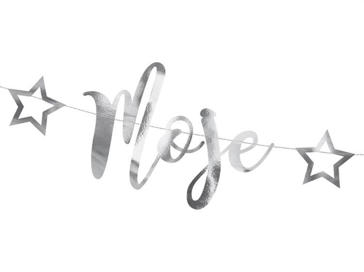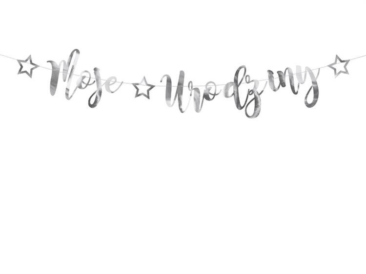 Baner przeszywany z papieru lustrzanego z napisem "MOJE URODZINY".