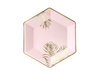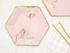 Talerzyki papierowe w kolorze różowym ze złotym wzorem liści.
