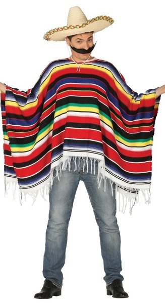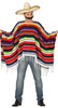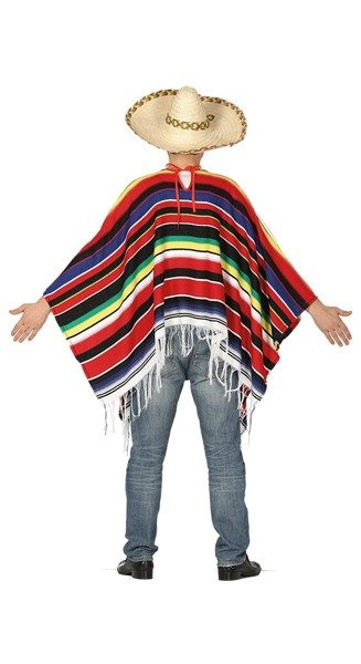 Kolorowe ponczo meksykańskie zdobione u dołu białymi frędzlami. Wiązane na karku.