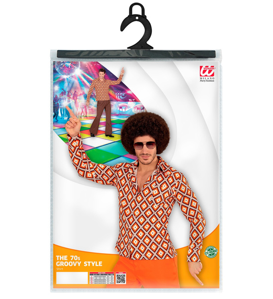 Koszula z długim rękawem, w stylu lat 70-tych.Kolor beżowy w brązowo-pomarańczowe romby.Zapinana z przodu na guziki.