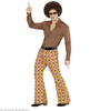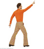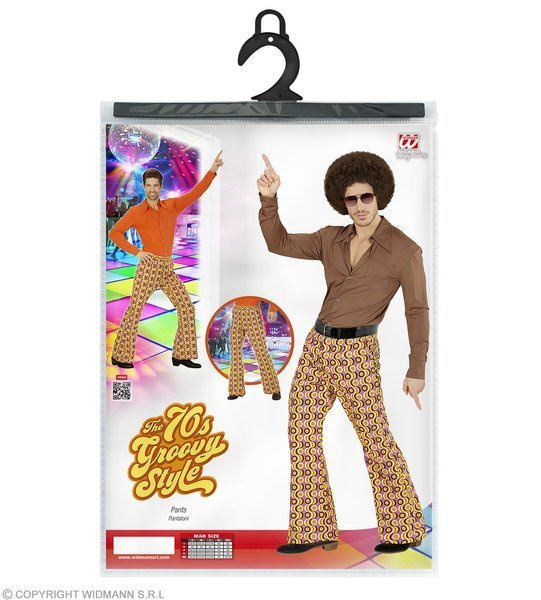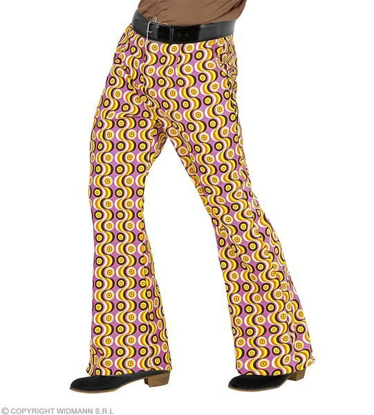 Spodnie typu dzwony wykonane z materiału w kolorowe wzory w stylu lat 70. W pasie wszyta gumka.
