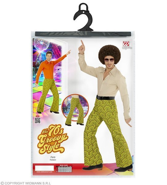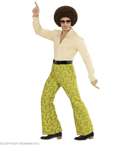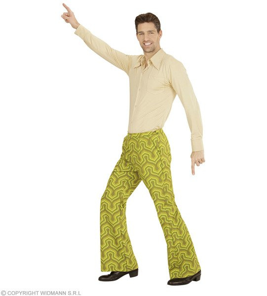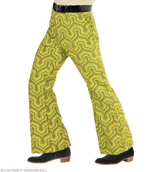 Spodnie typu dzwony wykonane z materiału we wzory w stylu lat 70. Zapinane na guzik i zamek.