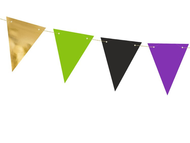 Girlanda Hocus Pocus - Flagietki, mix kolorów, do samodzielnego złożenia, zestaw zawiera 8 flagietek i ok. 2 m złotego sznurka, wymiary po złożeniu: wysokość ok. 15 cm, długość ok. 1,3 m.