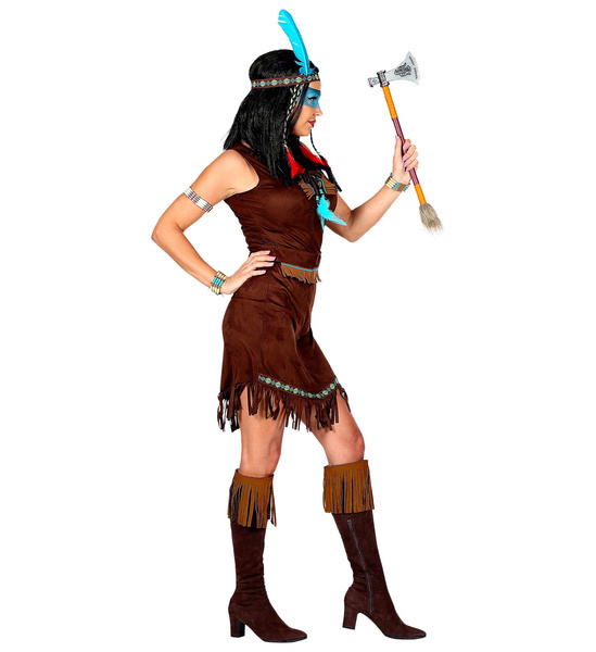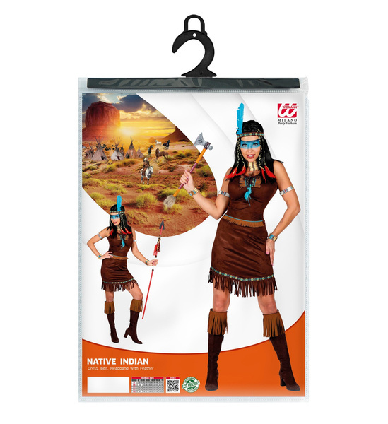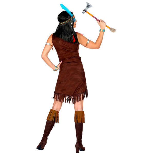 Strój w kolorze brązowym z frędzlami, z paskiem. Opaska z niebieskim piórkiem.