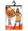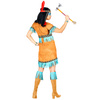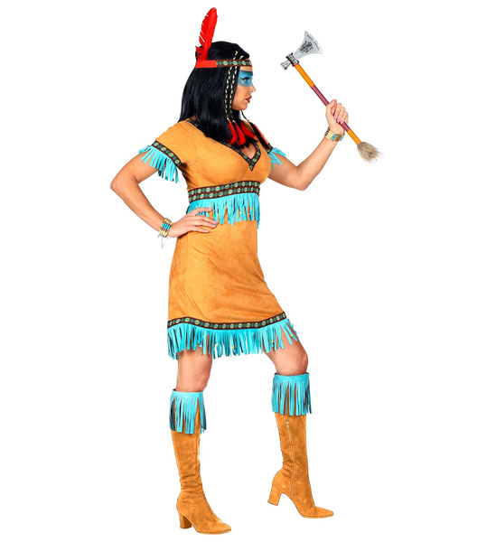 Strój w kolorze beżowym, zdobiony błękitnymi frędzlami. Opaska z piórkiem.