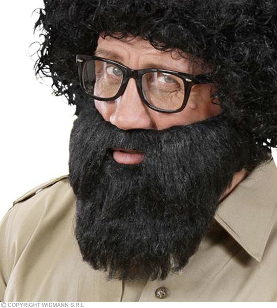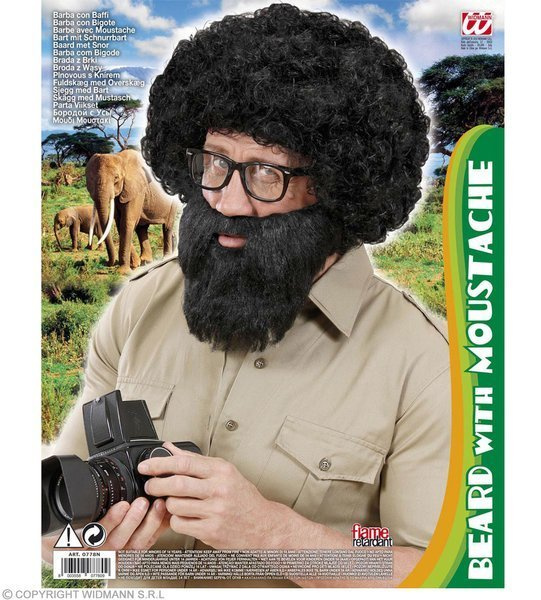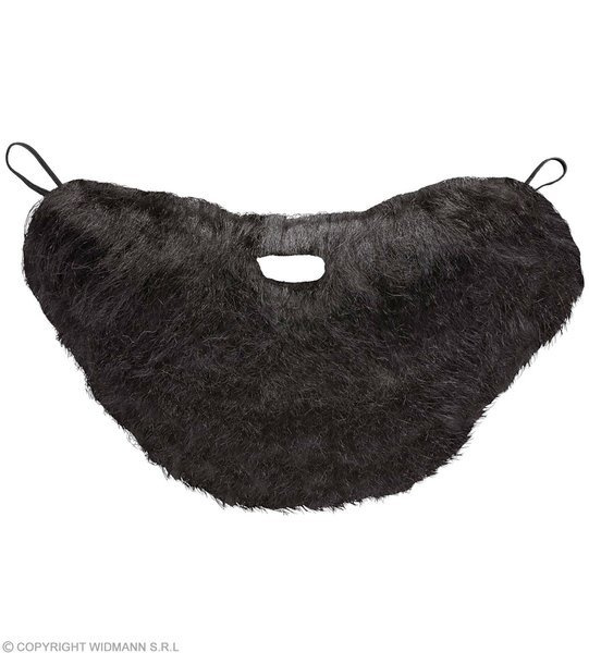 Broda połączona z wąsami, posiada otwór na usta. Broda mocowana jest na gumki na uszy. Wygląda naturalnie.