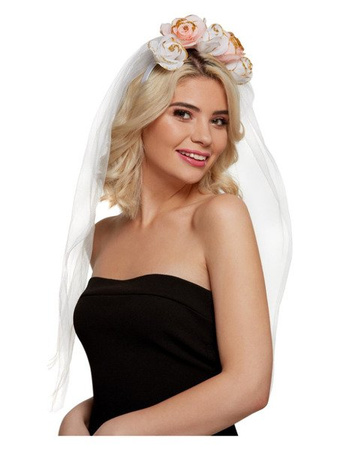Opaska w kolorze białym, z doczepionymi kwiatami oraz welonem z siateczki.