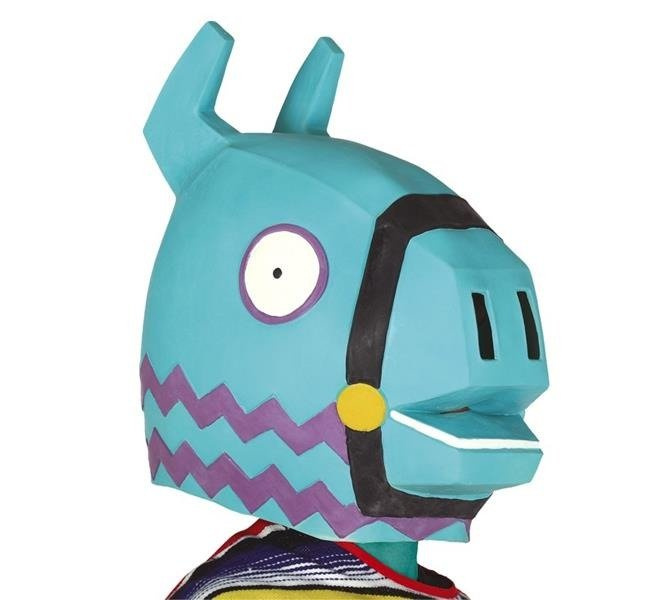 Maska lateksowa w kolorze niebieskim z kolorowymi wstawkami. Posiada otwór na oczy.